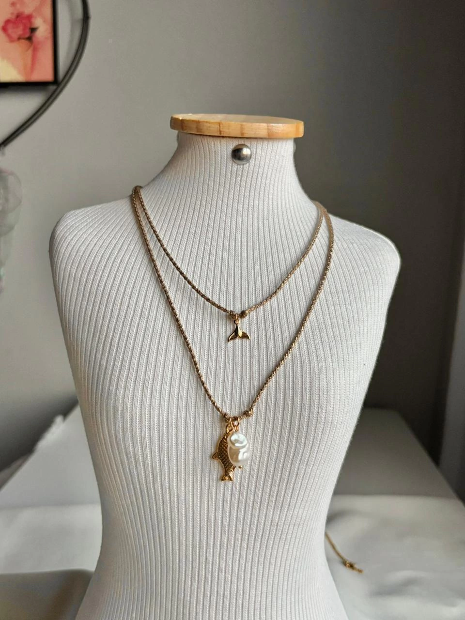 Colar feito de corda com pingentes dourados banhados a ouro 2 milésimos e pérola barroca.